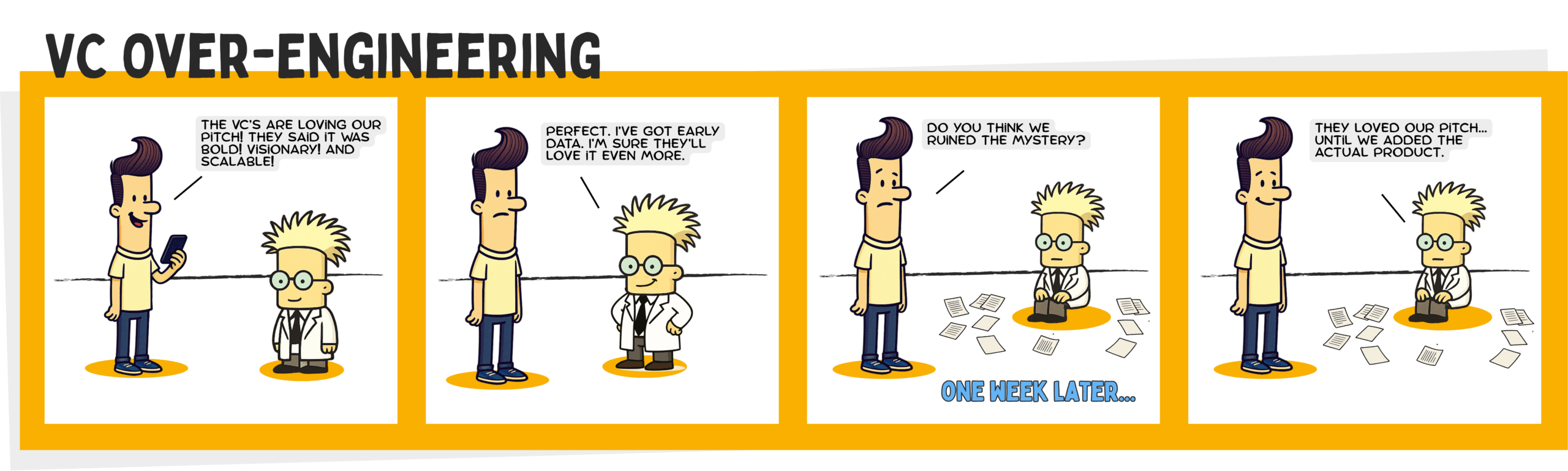 Then comes the crash: “They loved our pitch… until we added the actual product.”